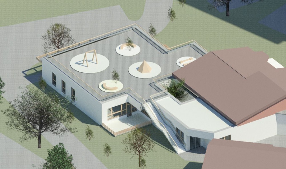 Due to space constraints, VG5 d.o.o. carried out the extension to the existing kindergarten. The extension is designed as a ground floor building with a flat roof, on which a play terrace is provided. The new extension will be connected to the corridor of the existing building, the path to the new premises will lead past the atrium, which will also serve as a partially covered play terrace. It will have three playrooms with their own terraces, three changing rooms, shared toilets, a cabinet for educators and an archive space. There is also space for heating and ventilation technology.